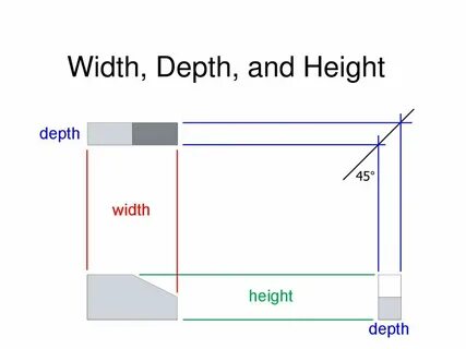 In the packaging and shipping fields, it is common to see the word length notation Width x Depth x Height (W x D x H), with width (along the side-to-side) dimension, depth (along the front-to-back) dimension, and height (as measured by lifting the dimension up or down) dimension. This standard is based on type of packaging orientations and shipping container designs.